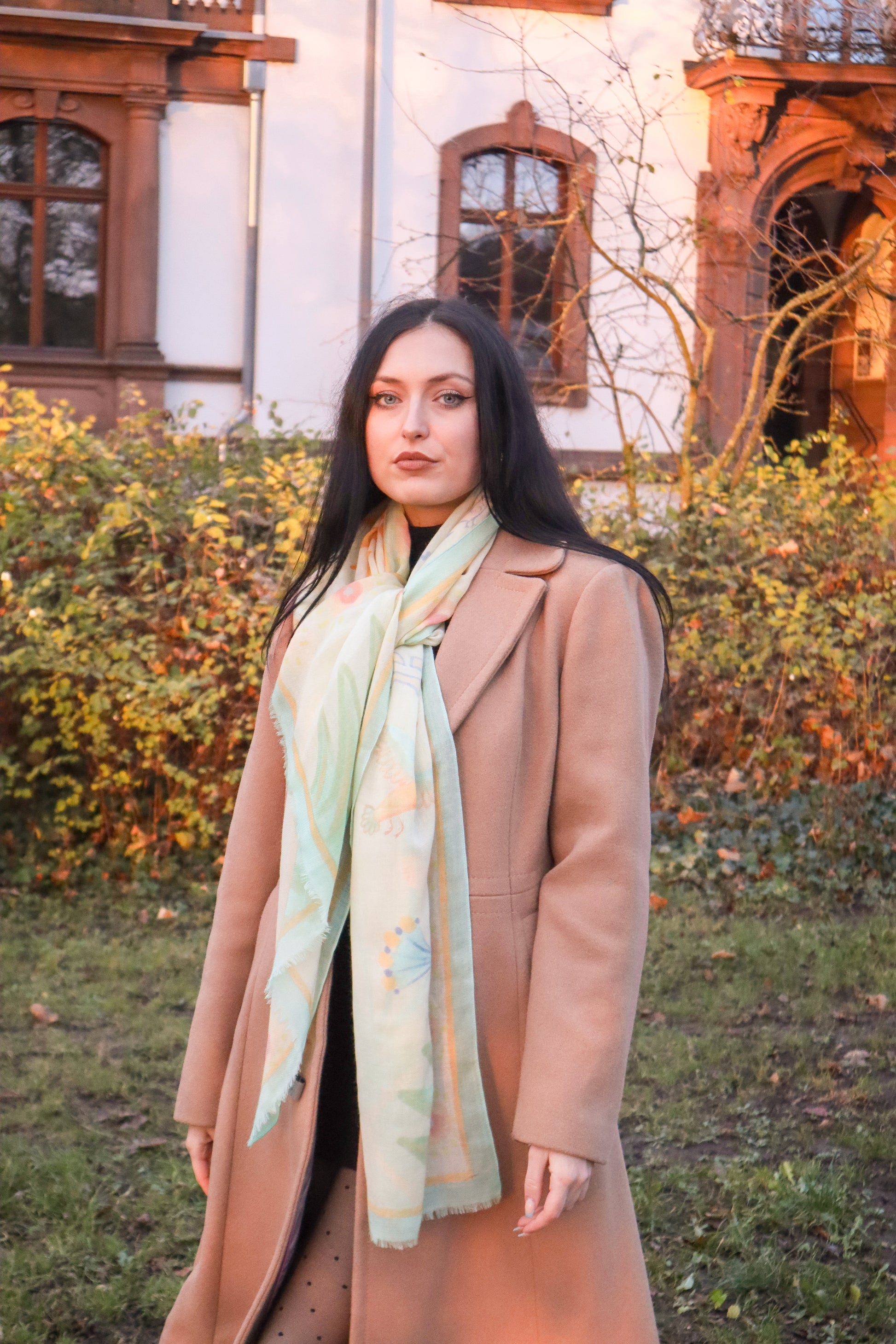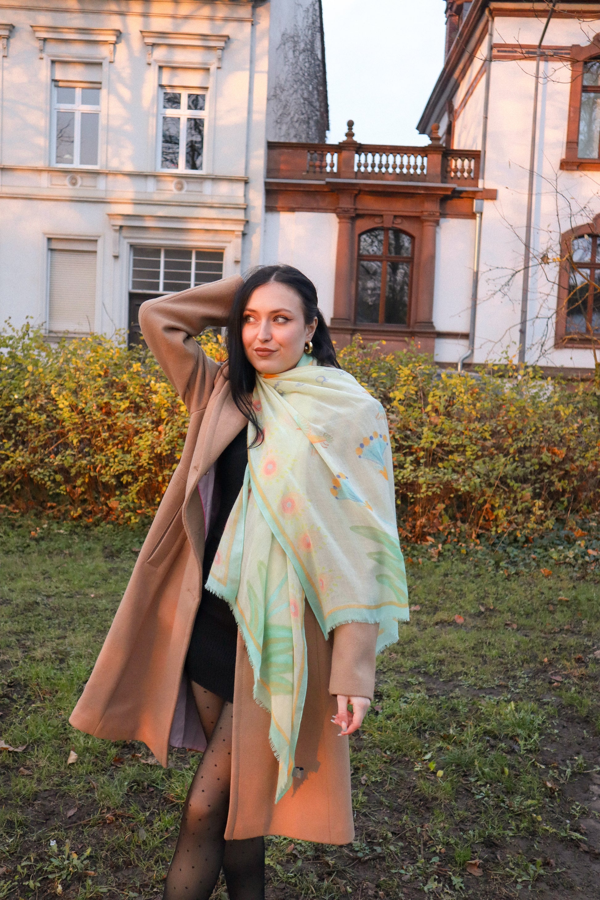 Inspired by Egyptology, this scarf brings together hieroglyphs and the rising sun, papyrus blooms, and graceful Nile geese. Its subtle, sun-lit colours keep the look elegant while adding a warm, radiant touch.